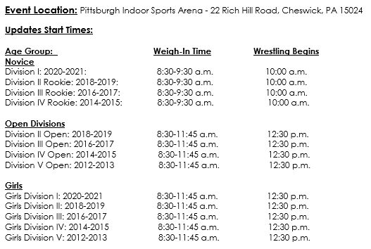 3. In some cases, your wrestler may be a first- or second-year wrestler, but if your wrestler has gotten a tremendous amount of mat time in that time or maybe just demonstrated an extremely aptitude for the sport (which is a great thing) it may be time to move up to the Open Division. For instance, if you find that your wrestler is pinning and tech falling their way through brackets multiple weeks in a row, it is likely time to move up. Thank you to all for your cooperation and efforts in making our great sport as fair as possible!